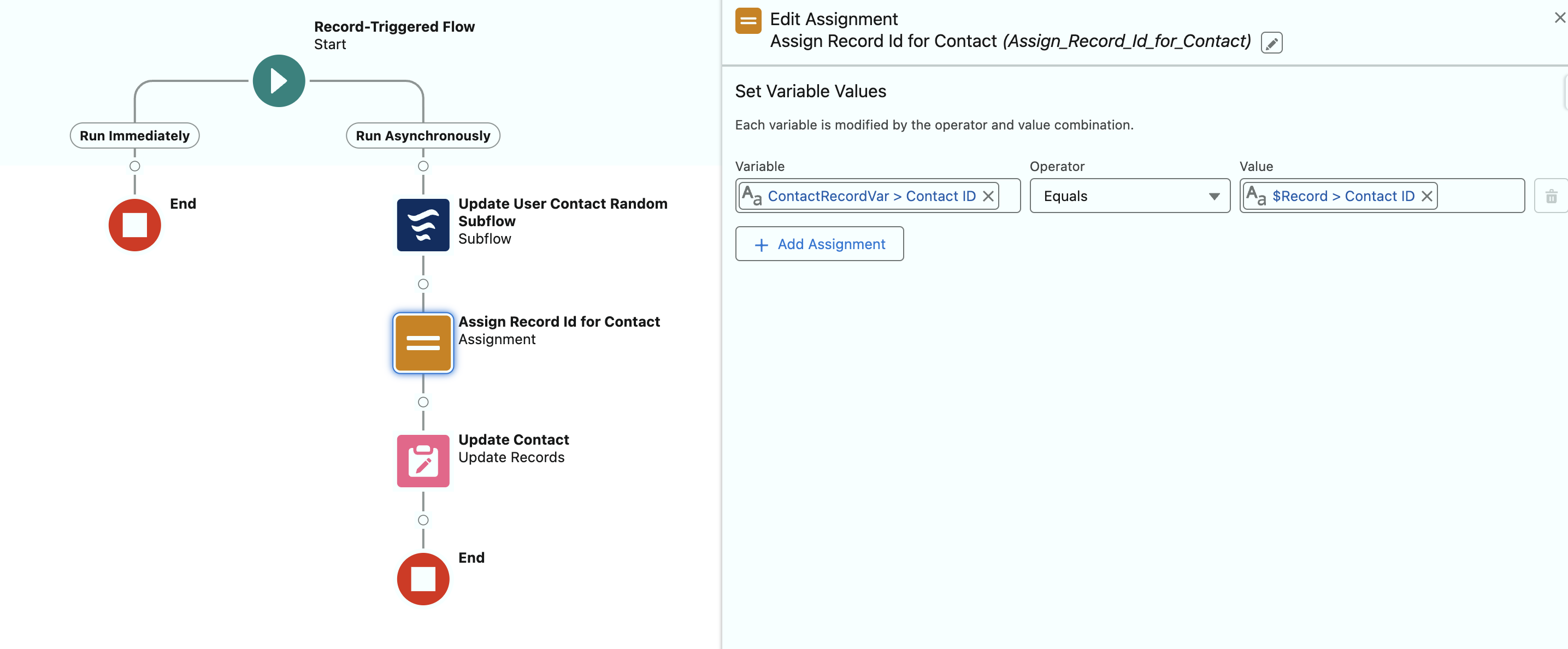 - When the record variable for the contact comes back from the subflow, the Id value is wiped out. I added an assignment to add the $Record.Id value back into the record variable. The Id is required for the update element.