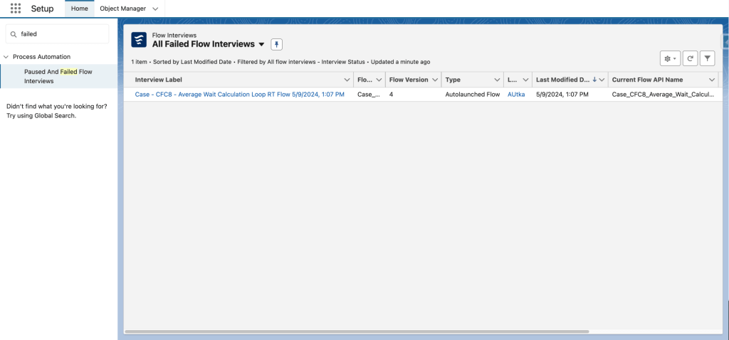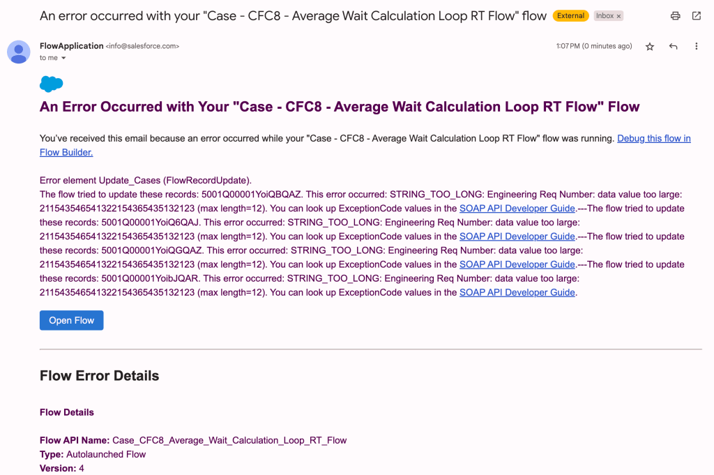 If your flow did not go down a fault path, then you can also go directly to the paused and failed flow interviews screen under setup to see the failed flow interview. This screen has the same link that the fault email provides. If you had a fault path (good for you), then the failed flow interview won’t be on that screen, but the email will be sent out regardless. Note that you cannot delete a flow version before all associated failed flow interviews are deleted.